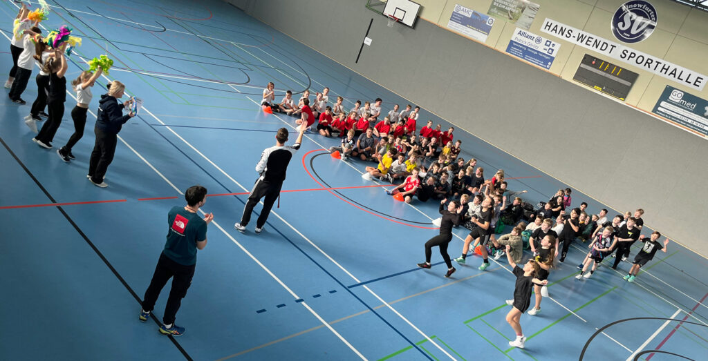 … so hieß es auf einem Plakat, das Kinder 5b hochhielten. Doch Fan-Wunsch und Sport-Wirklichkeit klaffen zuweilen auseinander. Das Zweifelderball-Turnier der Schorfheide bestritten am 21. November 2025 acht Teams aus den 4. und 5. Klassen der Grundschulen Groß Schönebeck, Lichterfelde und Finowfurt. Im letzten Jahr trug das Team Fifu 2 den Sieg davon, in diesem Jahr schauten die drei Finowfurter Mannschaften beim Finale den Kindern aus Lichterfelde und Groß Schönebeck zu. Die Stimmung auf der Tribüne war dennoch sensationell, eisern wie sonst nur Köpenicker Fußballanhänger feuerten die Finowfurter ihre Zweifelderball-Teams an. Stimmen der Spieler und Fans folgen …