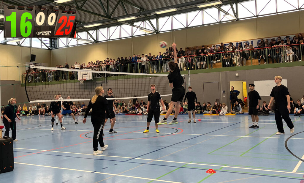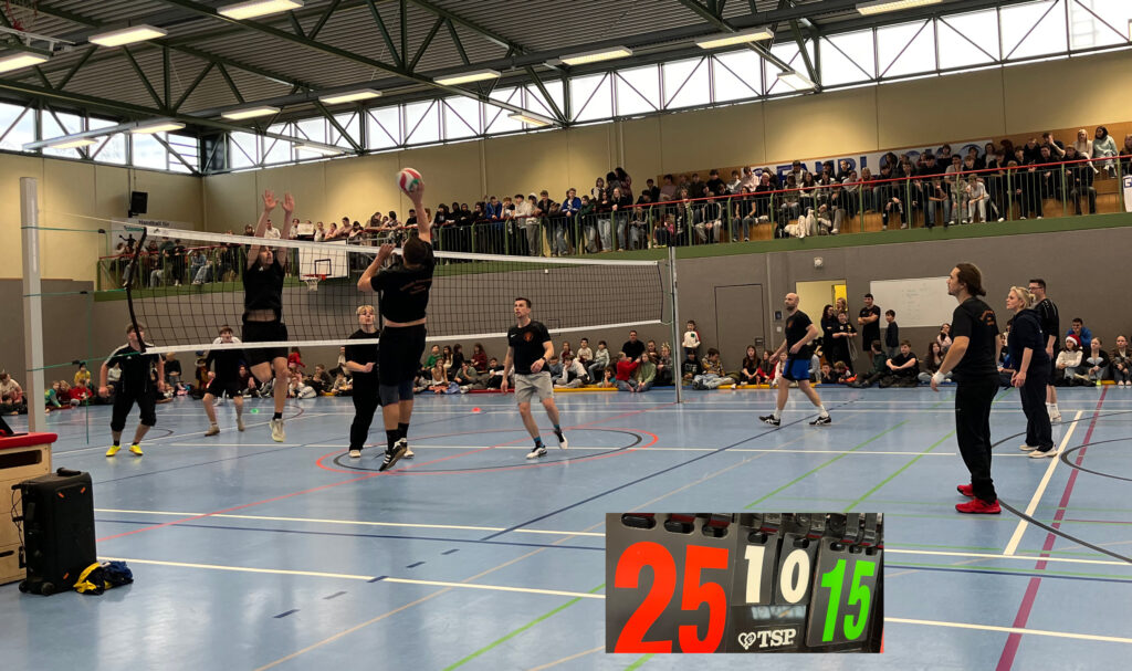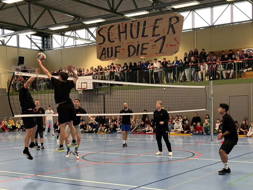 Die Halle war gut gefüllt – halb aus Sport- und Volleyballbegeisterung, halb auch, weil Zuschauen kein curricularer Inhalt ist, waren die Schülerinnen und Schüler hinüber in die Sporthalle geströmt, um teils die Lehrenden, teils die Lernenden zu unterstützen. Was sie alle auf dem Wunschzettel hatten, war ein packendes Spiel mit spektakulären Ballwechseln und voller Spannung.