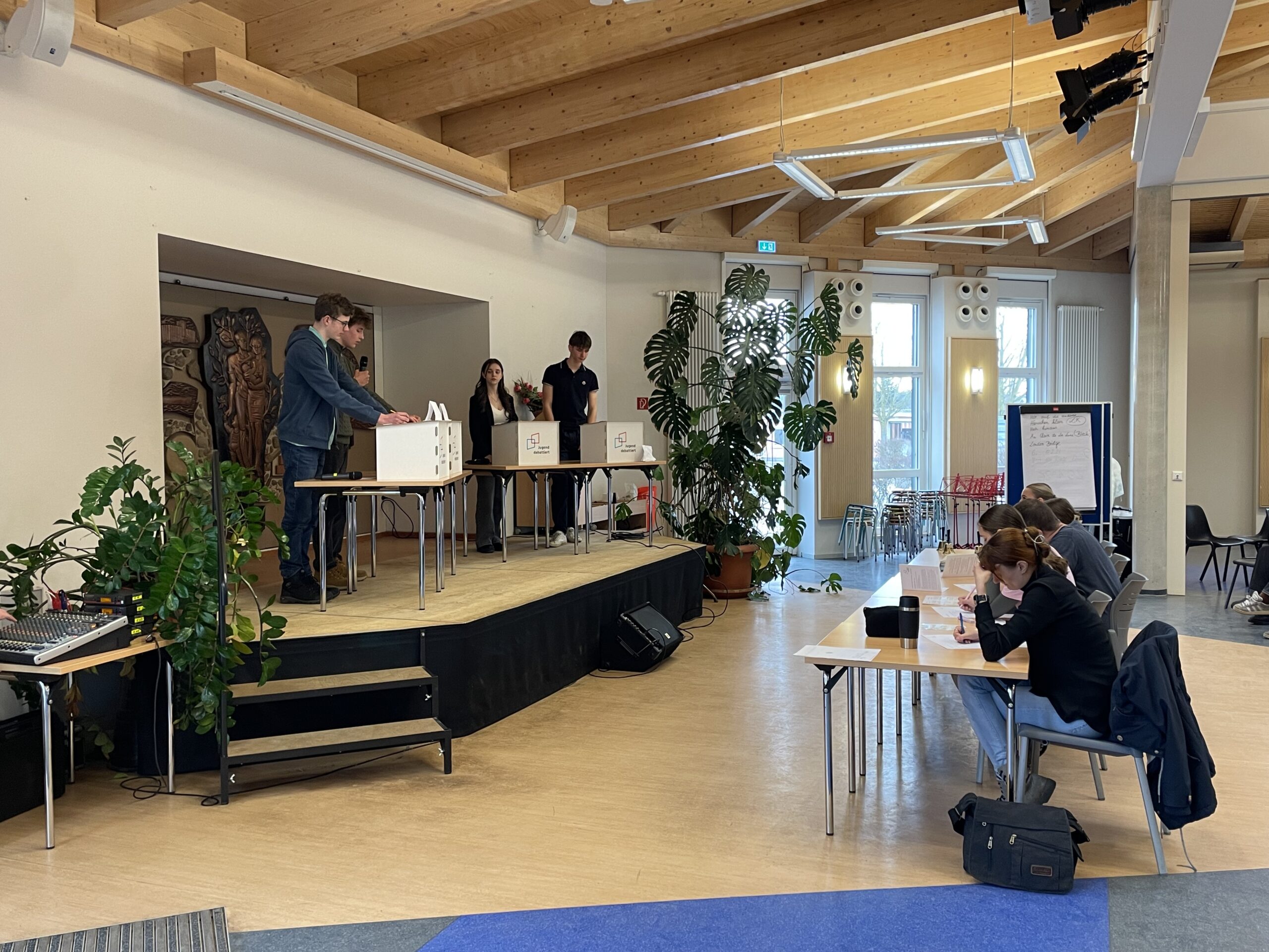 „Man gibt sein Bestes“, sagt Jakob noch vor der Eröffnung, „aber wenn’s nicht sein soll …“ Drei Punkte lassen alles (h)offen. Es ist seine zweite Teilnahme an einem Regionalwettbewerb, die erste war noch in der AG 1, „bei den Kleinen“, wie sie hier sagen. Wie Jakob kommt auch Viktoria vom Christa-und-Peter-Scherpf-Gymnasium Prenzlau. Sie möchte sich „gegenüber dem letzten Mal verbessern.“ Da war sie „nur“ als Zuschauerin zum Landesfinale gefahren, dieses Jahr möchte sie vorne stehen. Ihrer Analyse nach sind die Themen in diesem Jahr „so naja“. Wie? „So dass man viel draus machen kann, wenn man es richtig macht.“ In der ersten Runde werden die beiden gegeneinander antreten (sie pro, er contra), aber das wissen sie jetzt noch nicht.