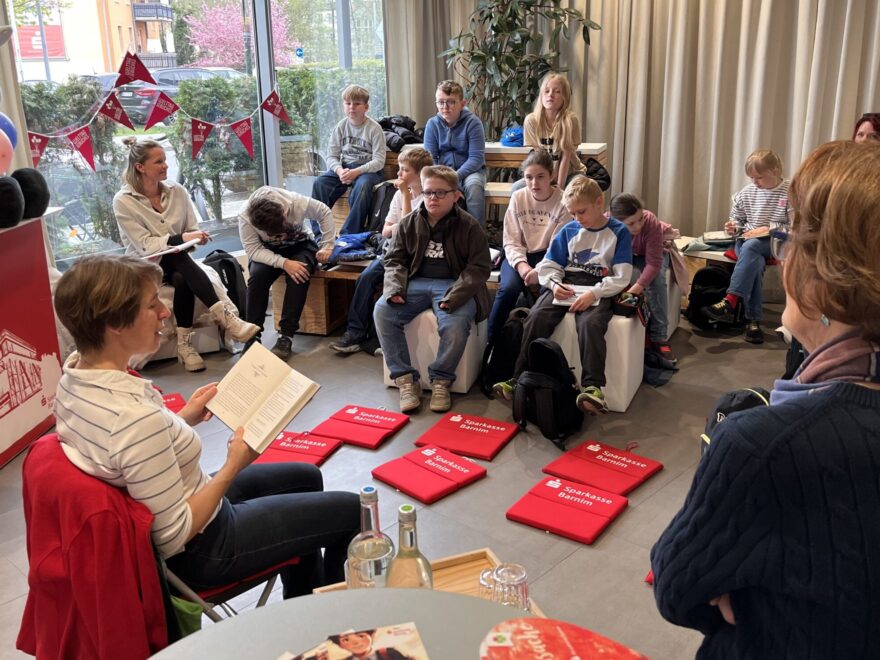 Zum Welttag des Buches hatten Frau Puppe-Mahler und Herr Mahler von der gleichnamigen Buchhandlung wieder zahlreiche Lesungen für Kinder aus Eberswalde und Umgebung organisiert. Aus Finowfurt waren die 2b von Frau Nobis und die 4a von Frau Syhring der Einladung gefolgt. Im Forum der Sparkasse las Goldschmiedemeisterin Antje Kannewurf die magische Geschichte von Tilly Evermore vor. Die Buchhandlung Mahler ermöglicte es, dass die Klassen das Buch, aus dem vorgelesen wurde, als ihr eigenes mitnehmen durften, so dass die Kinder die ganze Geschichte erlesen können.